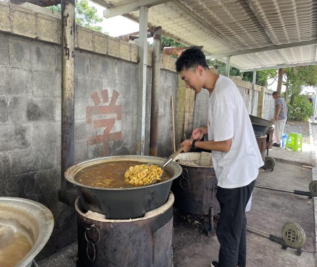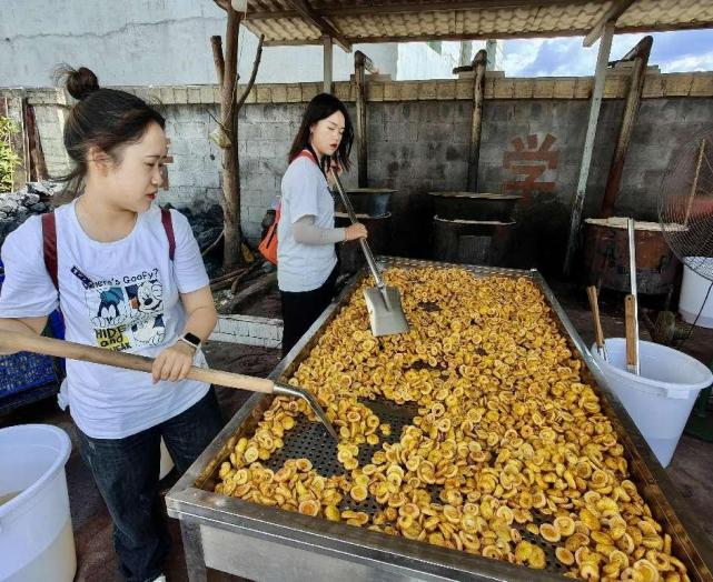 在杨主任的带领下,我们穿梭在农户的小型生产线中,“黔食实践队”成员亲自参与到了从切片、人工漂烫、人工辅助冷却、人工晾晒、糖水熬煮等多道复杂的工序中,力求从实践中去发现问题、找到问题关键,再解决问题。