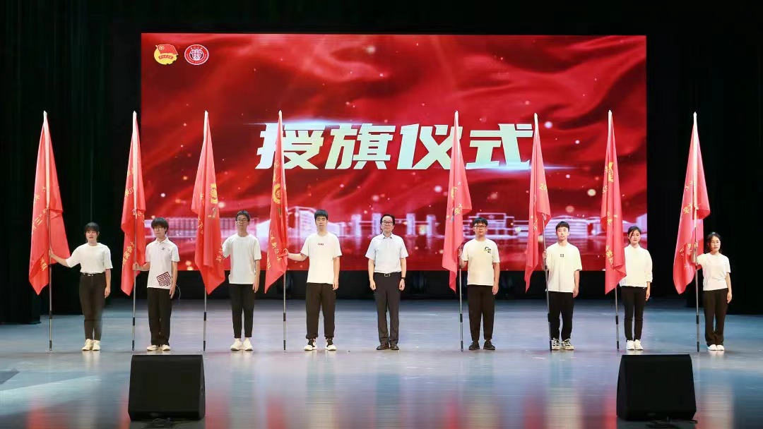 (图为校党委书记李建军教授为“三下乡”社会实践队团队代表授旗)