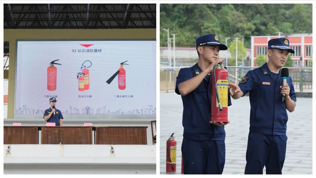 消防演练集合后,消防救援队员从灭火器的类型和使用、日常生活中需要注意的消防知识和面临火灾时的处置原则等方面对全体师生进行详细讲解,加深同学们对消防安全的认识。