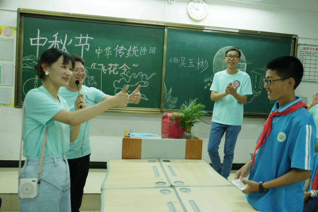 据悉,我校第24届研究生支教团锦屏支队全员策划本次吟诵鉴赏中华经典诗文之“飞花令”活动,是锦屏县第四中学首次开展的特色中秋节主题班级活动。本次妙趣横生的活动让同学们充满期待,轻松愉悦的活动氛围让同学们在放松心情的同时品读我国优秀的中华经典诗词文化。希望此次飞花令活动能让学生在学习之余感受到诗词的快乐,更加健康茁壮成长!