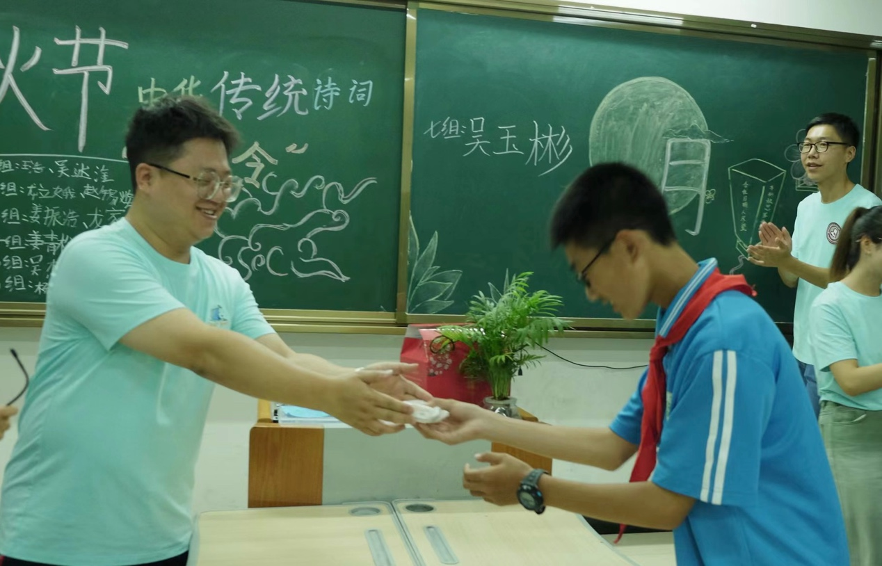 锦屏县第四中学校团委书记欧阳可刚为本次飞花令活动擂主颁发月饼,并向同学们送上节日的祝福,现场洋溢着浓浓的中秋节日氛围。