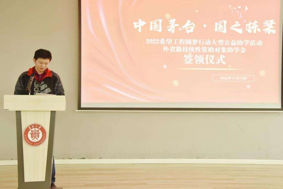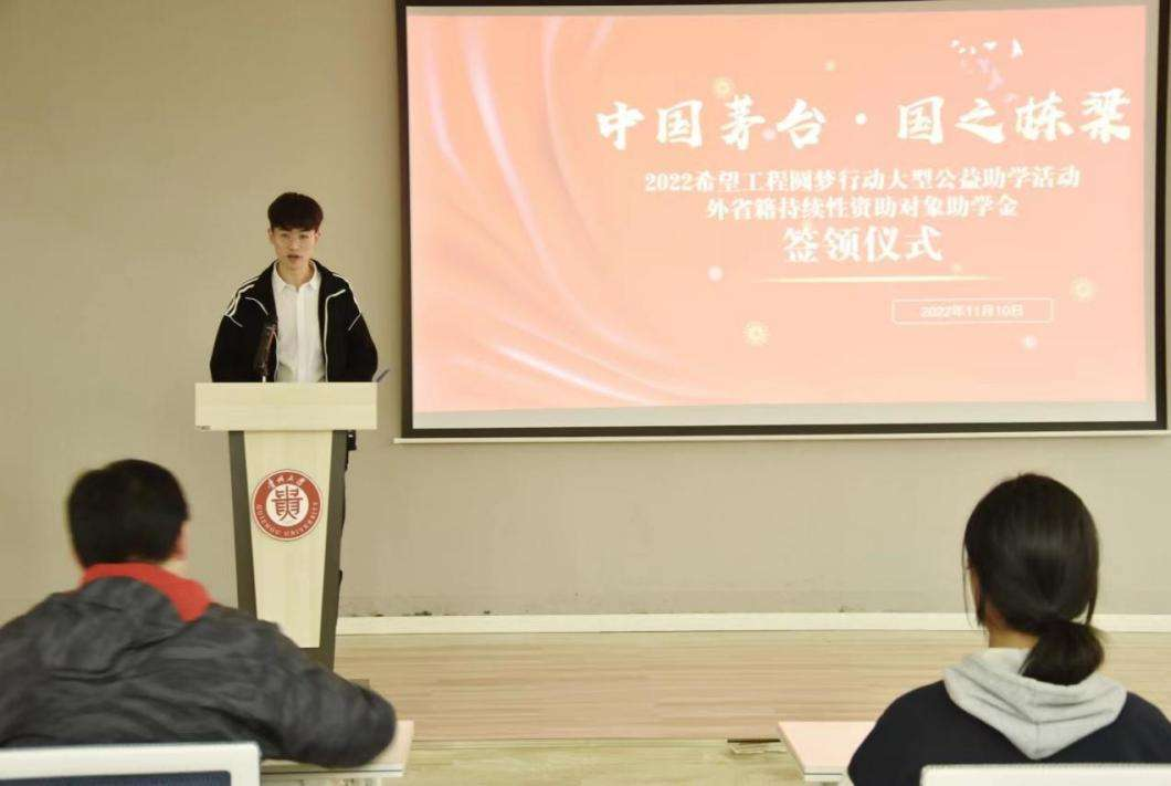 团委网站讯11月10日下午,“中国茅台·国之栋梁2022希望工程圆梦行动大型公益助学活动外省籍持续性资助对象助学金”签领仪式于雅文楼217B教室举行,校团委副书记高廷红出席,2022级和2021级学生代表参加。