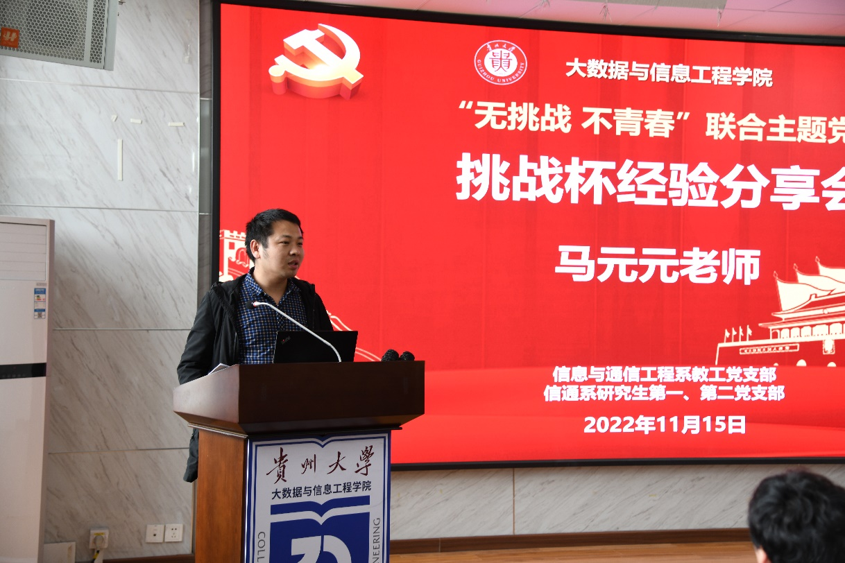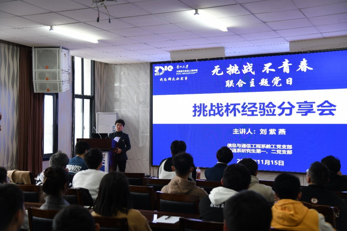 团委网站讯(记者 杨璐娴 报道)11月15日,大数据与信息工程学院在崇理楼509报告厅开展了我为群众办实事“无挑战,不青春”联合主题党日活动。学院信通系教工党支部、信通系研究生第一和第二党支部,信管专业2103班全体学生,以及全院对“挑战杯”感兴趣的本科生等一百余人参加。本次活动旨在促进同学们对”挑战杯“竞赛的了解,激励同学们积极参与创新创业大赛。