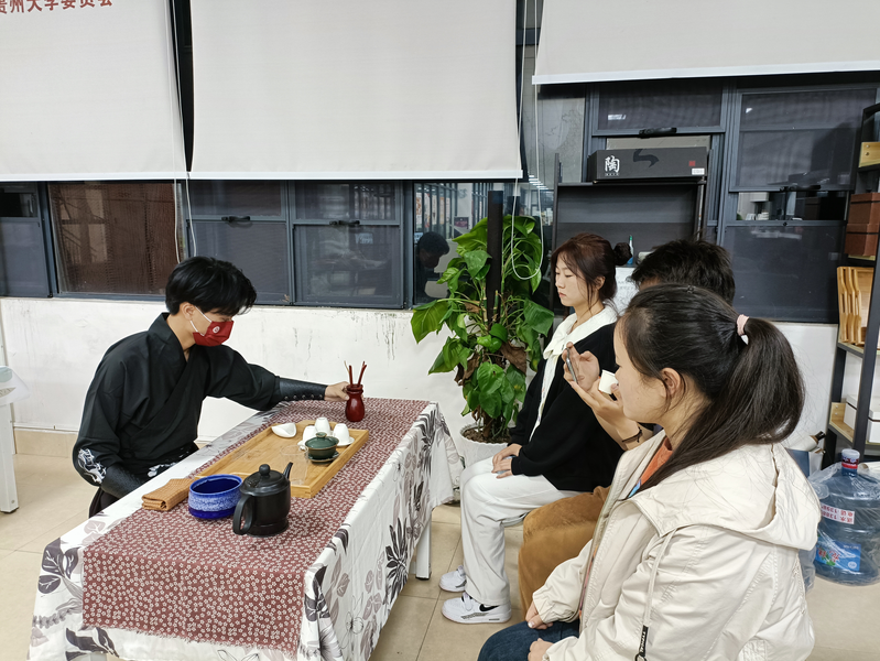 茶话会首先进行对遵义红茶和高山白茶的品茶活动,同时昆虫协会向茶道社同学分享食用昆虫——油炸蚂蚱,食用昆虫的美味得到了同学们的肯定。而后茶道社向同学们介绍茶具,并进行了茶艺表演,同学们在茶道社同学指导下体验泡茶,切身感受中国茶文化。随后,昆虫协会向茶道社赠送蝴蝶标本,对茶道社的支持表达感谢。
