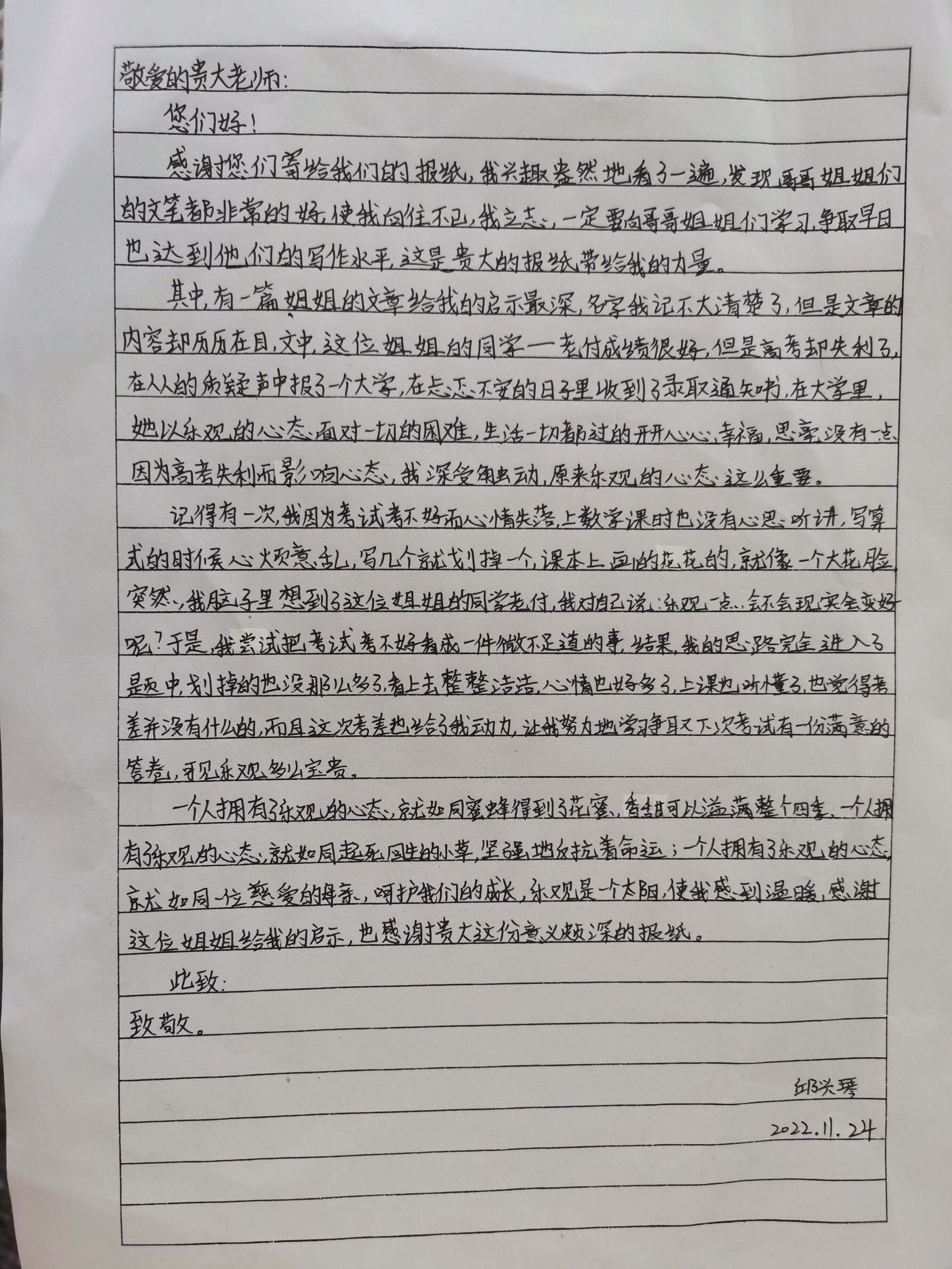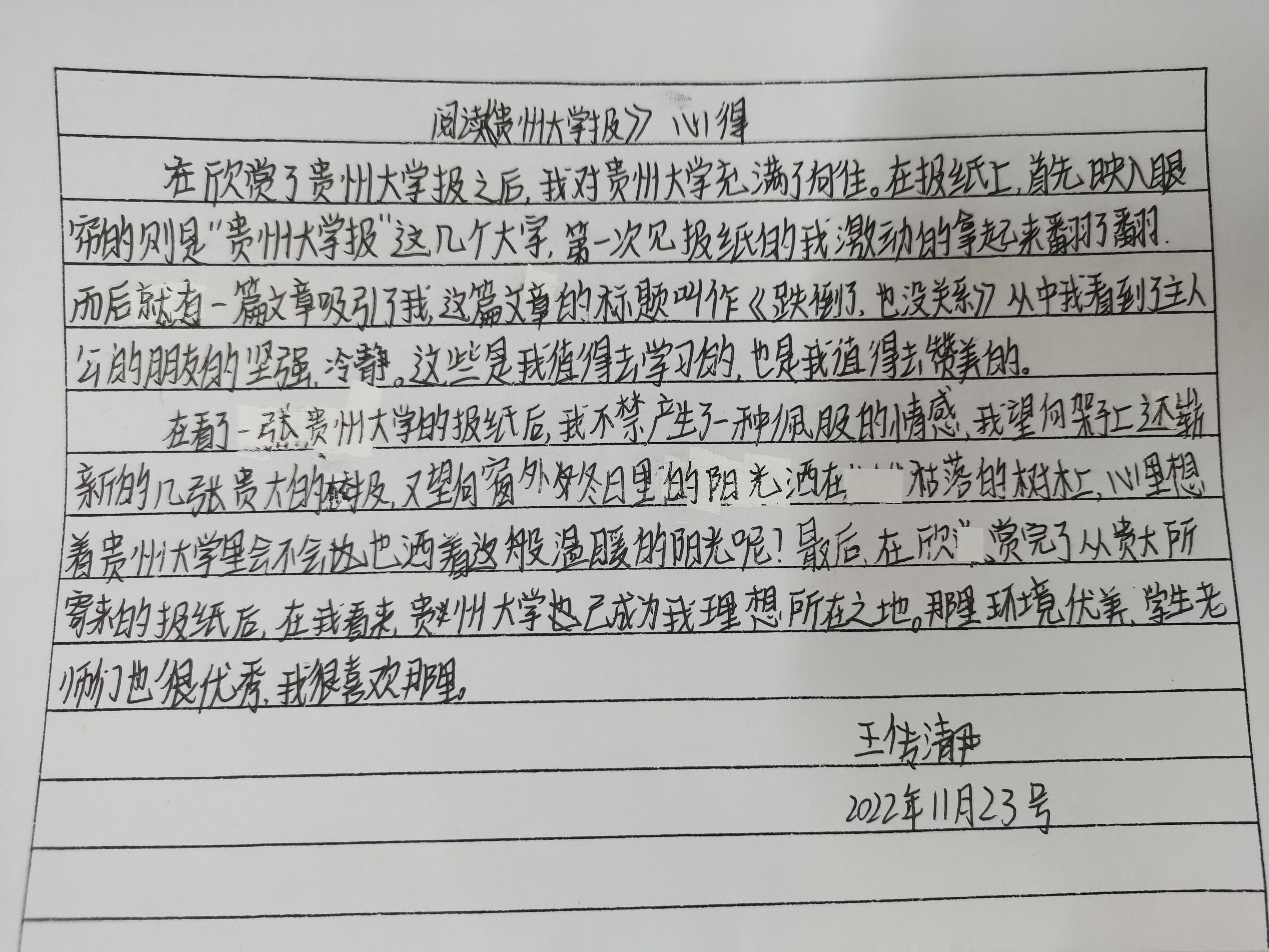 “在阅读了《贵州大学报》之后,我对贵州大学充满了向往。报纸上所报道的优秀的老师和哥哥姐姐们的事迹,值得我赞美和学习,也激励着我好好学习,向着理想之地大步前进。”贞丰县第二中学的王传清伊说。