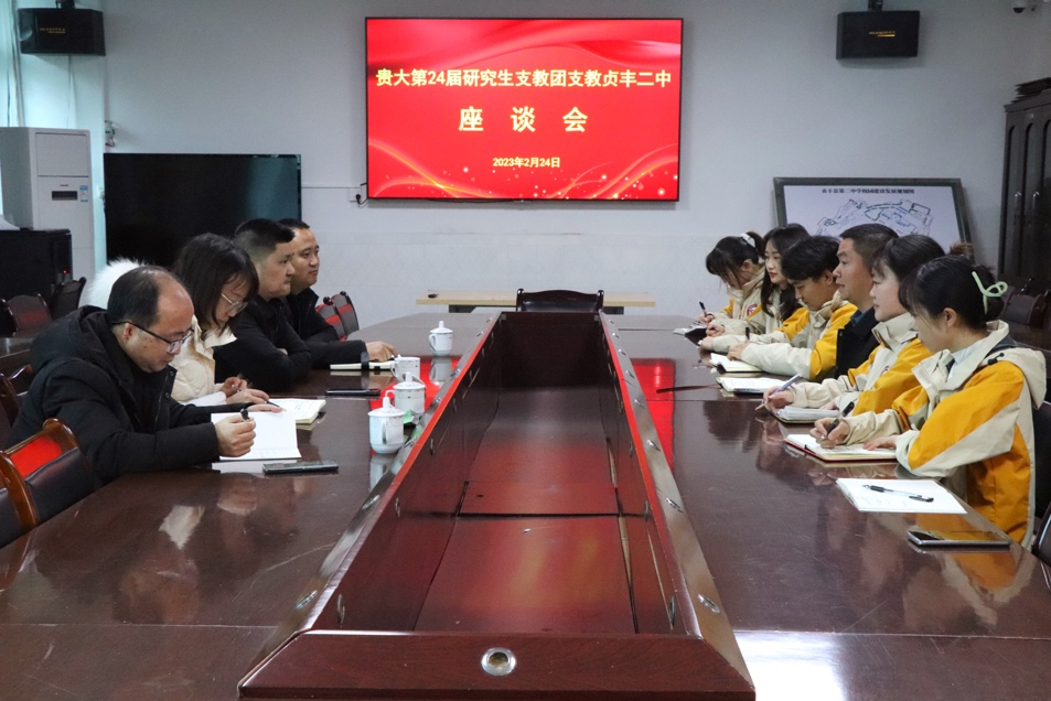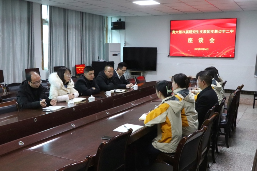 团委网站讯(记者李长生姚靓靓报道 |韦雄 王合龙 摄影)2月24日下午,贞丰县人民政府副县长、县委教育工委副书记严匡卿,贞丰县教育局局长保正权、副局长何永,共青团贞丰县委员会副书记王露江赴贞丰县第二中学看望慰问贵州大学第24届研究生支教团贞丰支队(以下简称贵大第24届研支团贞丰支队)成员并召开座谈会。贞丰县第一中学校长张荣生、贞丰县第二中学副校长(主持工作)钱保华、贵大第24届研支团贞丰支队全体成员参加座谈会。