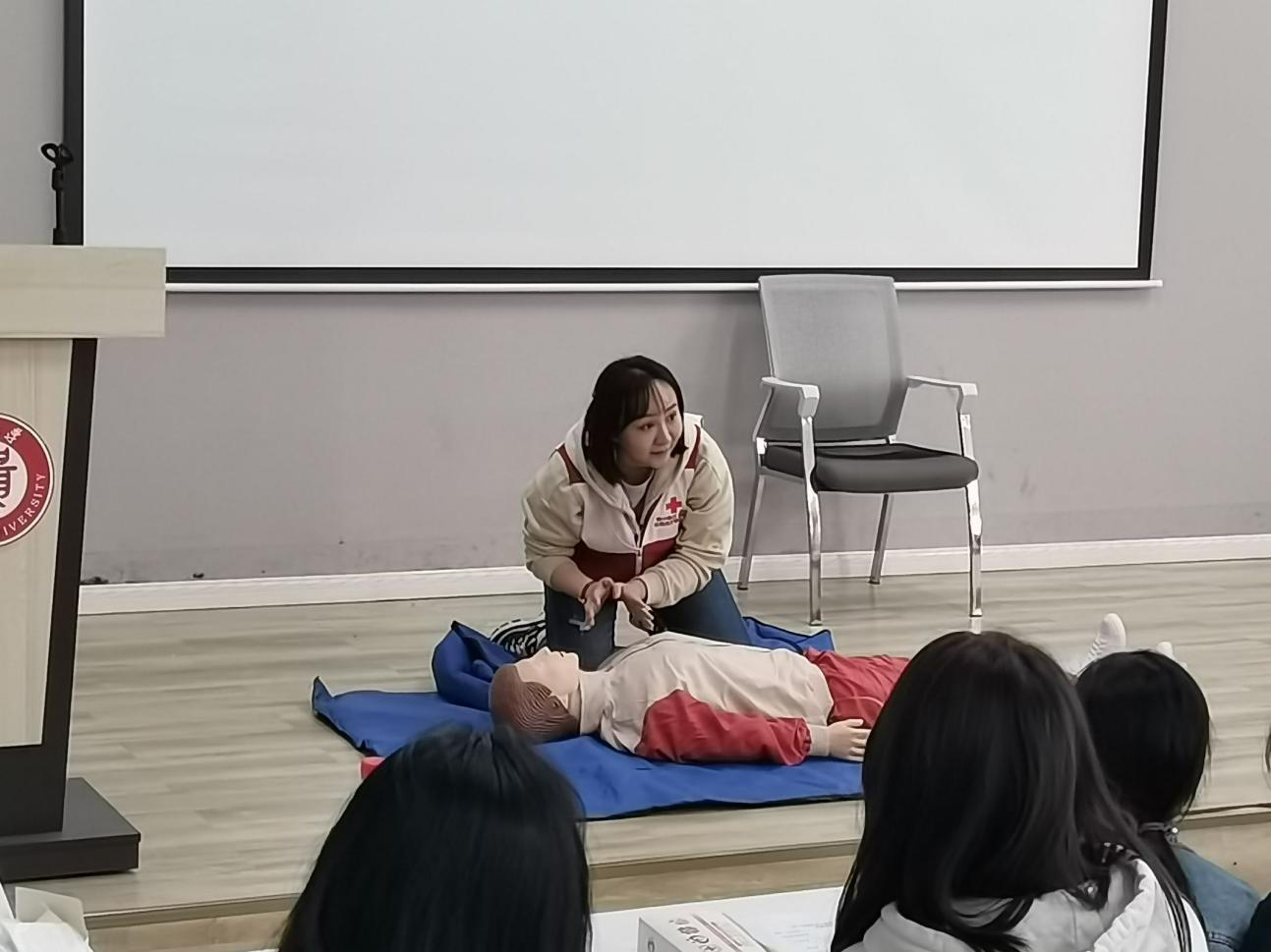 (袁媛为志愿者们展示正确心肺复苏方法)