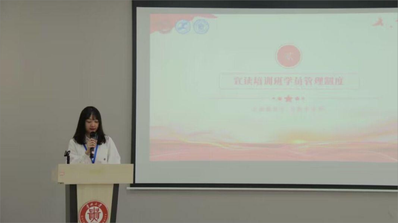 校学生会组织监察部部长张馨梓宣读培训班学员管理制度,向学员们宣读有关学习管理和考核方式等规章制度。