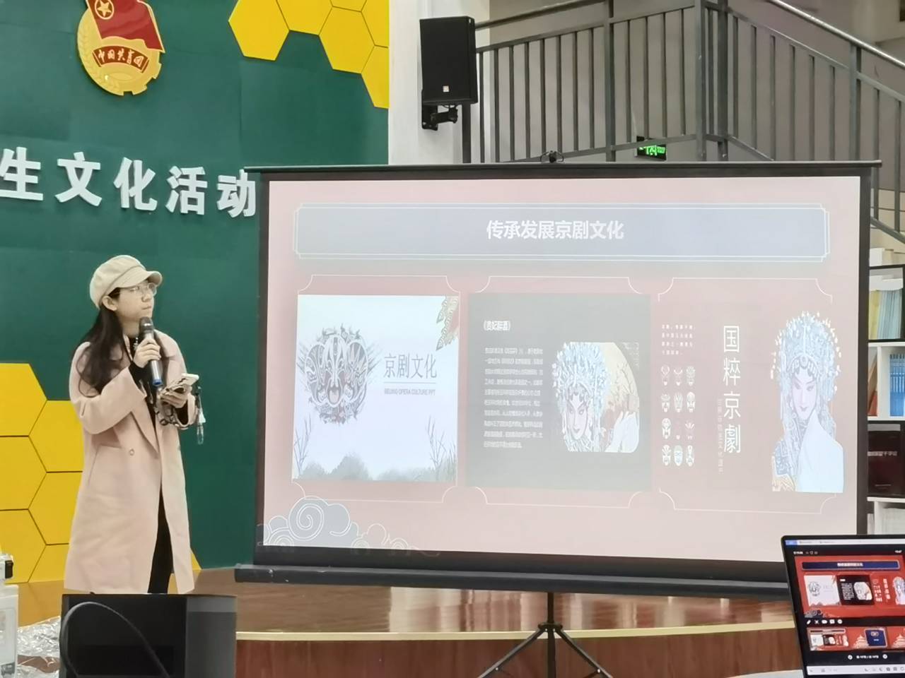 活动前,主持人从色彩、造型、谱式等方面讲述了深厚浓郁的京剧脸谱文化,并重点介绍了不同京剧脸谱颜色的代表人物及背后的故事,如忠义耿直的“红脸”关公,威武正直的“黑脸”包公,奸诈多疑的“白脸”曹操,引导同学们分辨真善美和假恶丑。