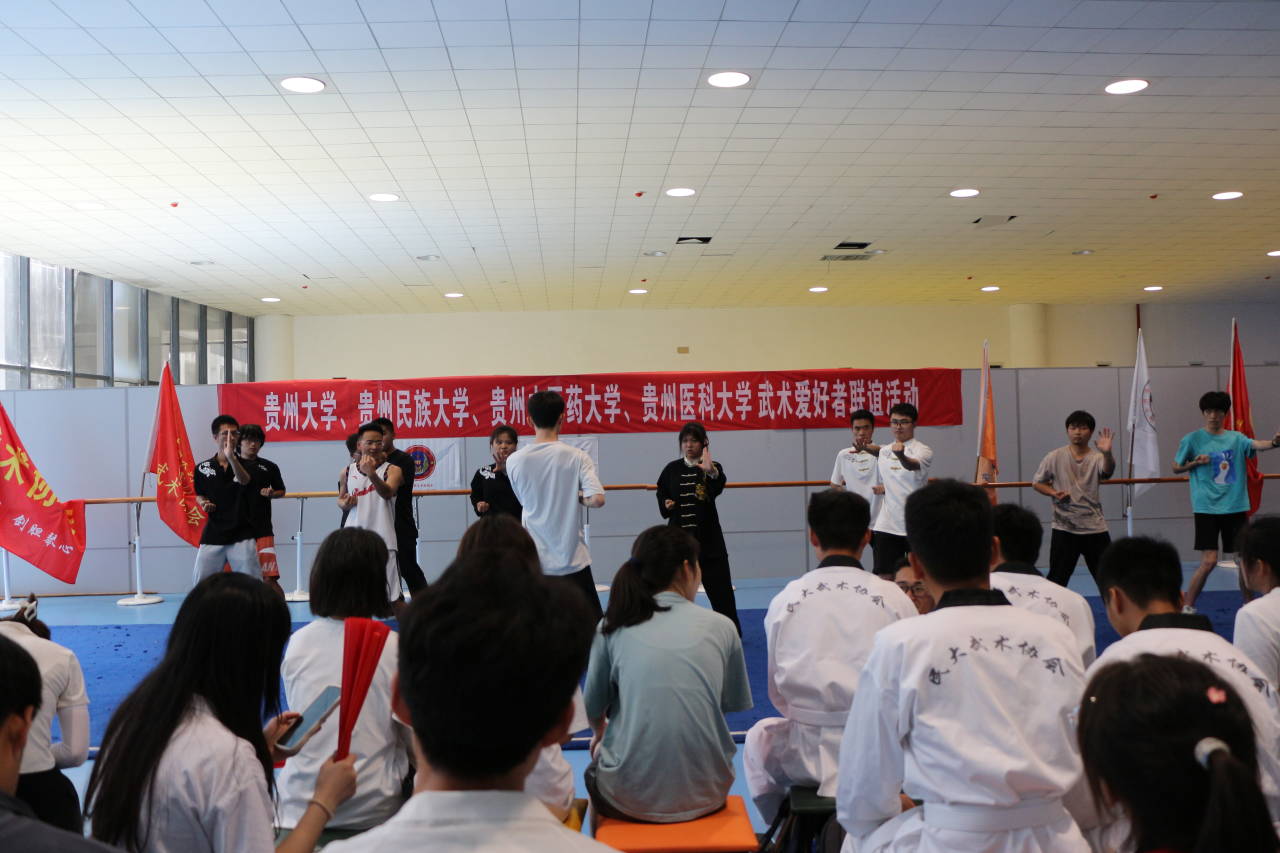 团委网站讯(记者 岑运磊 报道│摄影 罗晴)5月27日,来自贵州大学、贵州民族大学、贵州中医药大学、贵州医科大学的7个武术类社团在西校区体育馆开展武术交流活动,100余名武术爱好者齐聚一堂,给大家上演了一场精彩的武术文化盛宴。
