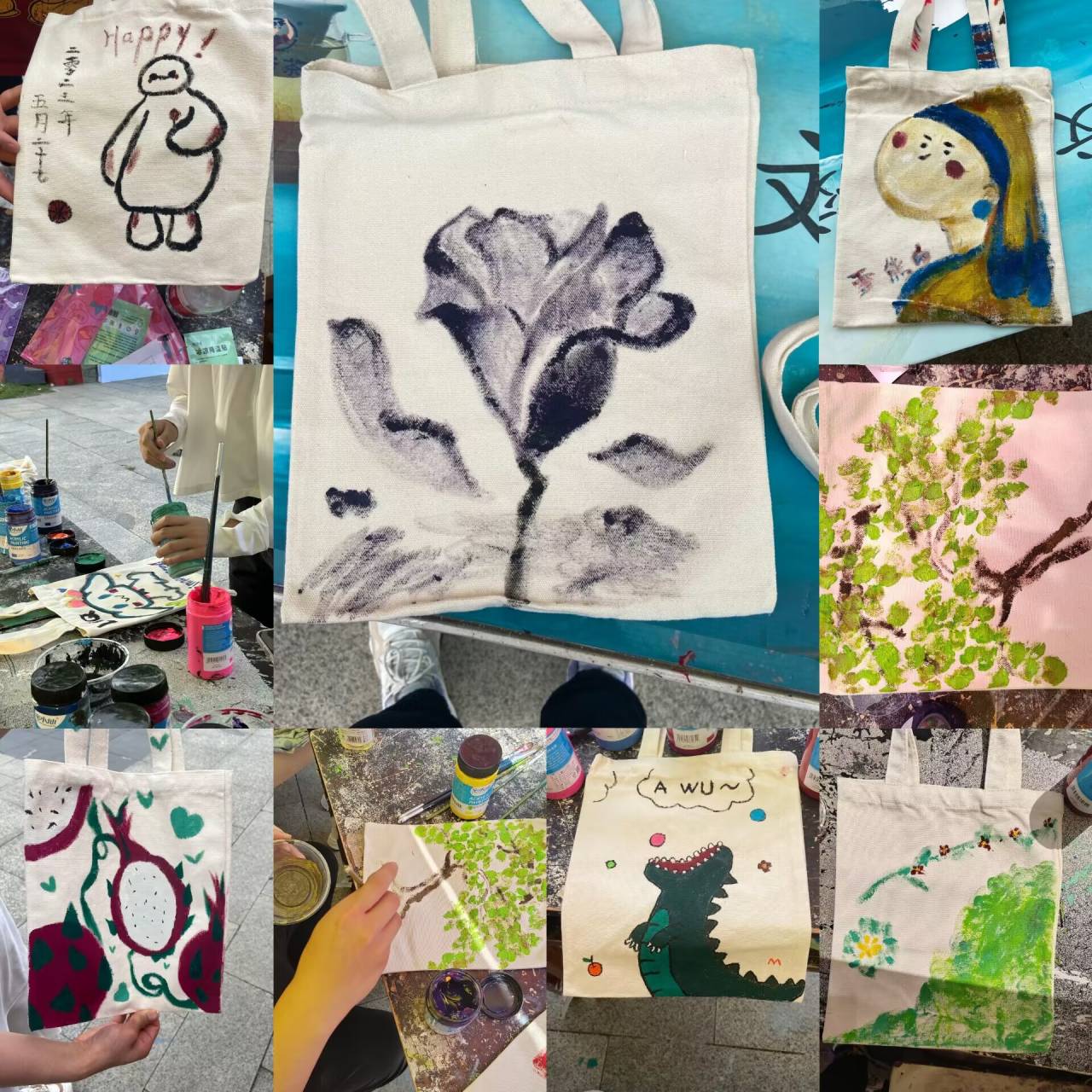 “绘趣无限,环保袋回家”活动通过购物袋绘制的方式,让同学们在绘画过程中切实培养环保意识。绘制完成后,同学们留下了众多风格各异的作品。