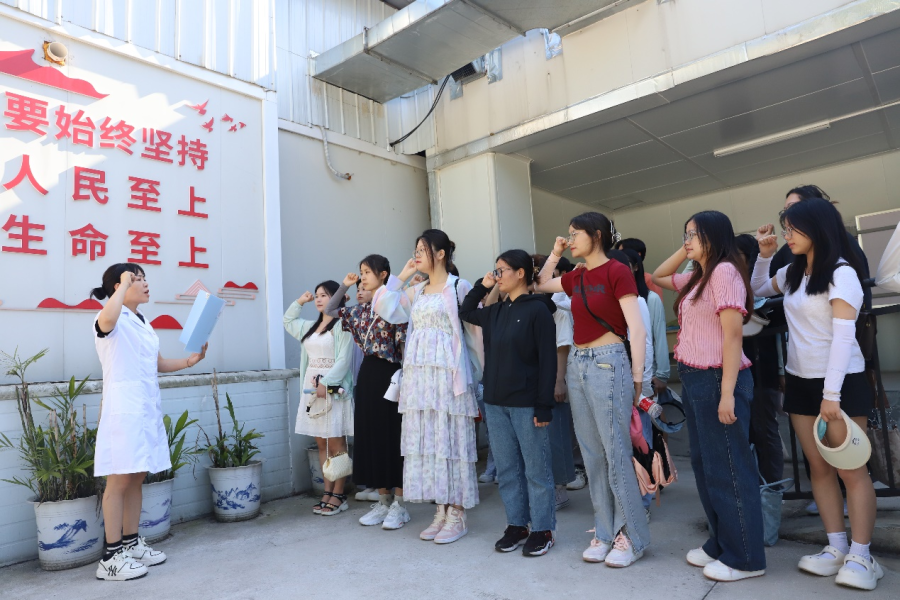 最后,在医护人员的带领下重温了医学生誓词,在这个特殊的地方宣誓,比以往的每一次宣誓都更加牢记在队员们的心里。