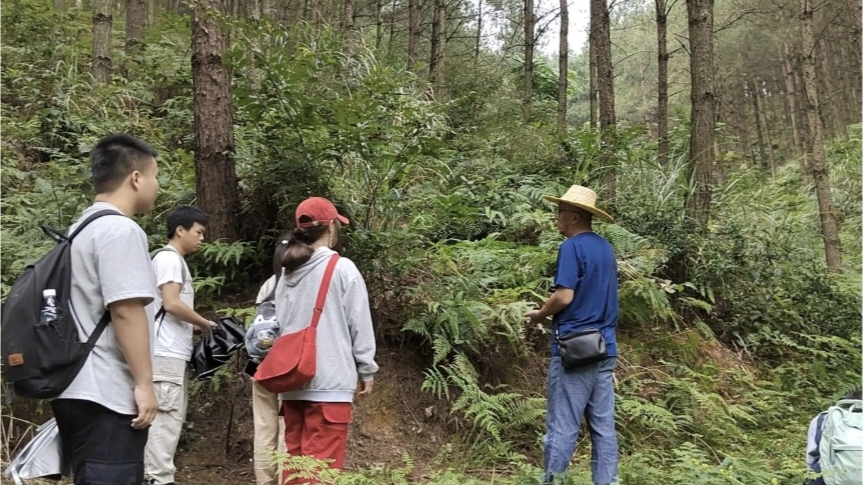 在广顺镇国有林场火炬松林里,祝小科为实践队进行讲解挖土搬运和种植灵芝菌棒。他强调,灵芝和茯苓在马尾松林下能得到很好的生长,因此当地依托长势良好的马尾松林,投入新兴的科研成果和技术,大力发展林下仿野生种植科技项目,充分利用了林下资源的同时,一定程度上带动了当地的农村经济发展。