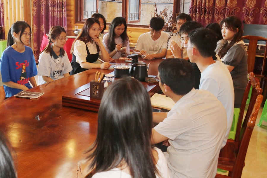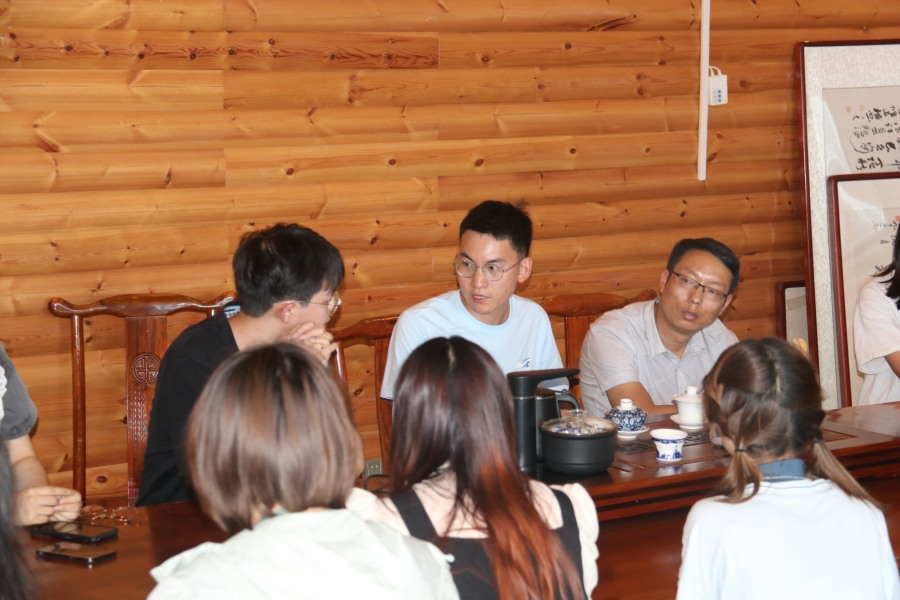 在叙茗园茶园大厅,实践小队成员与久安乡团委开展以乡村振兴为主题,围绕久安乡的产业转型与社会治理等多方面展开深入交流与探讨。