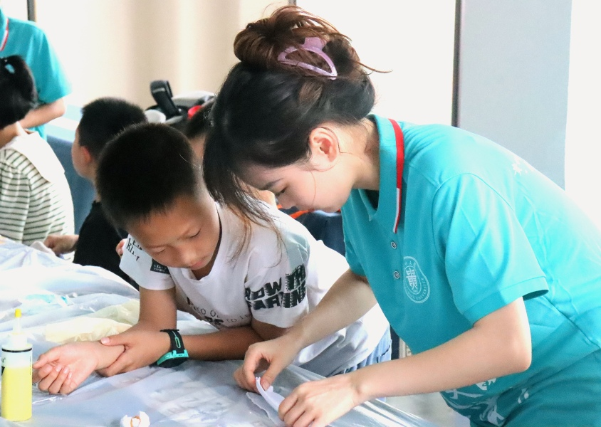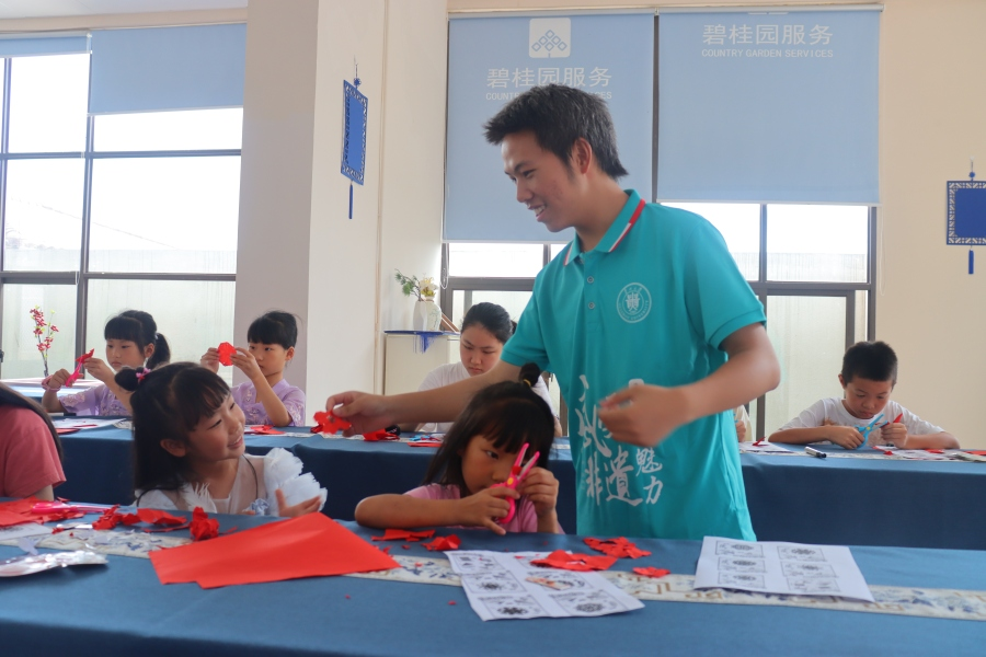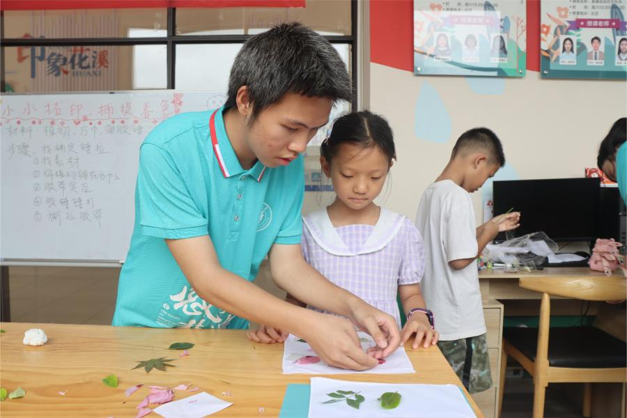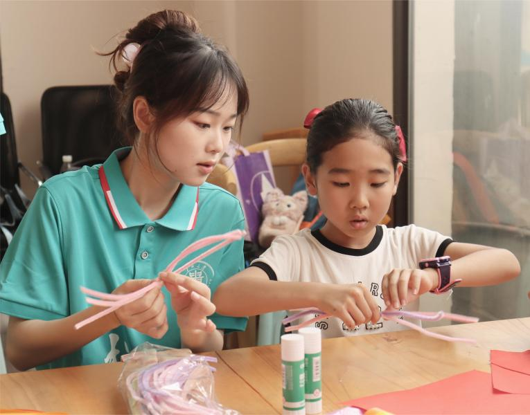 团委网站讯(记者董红霞报道|摄影 蒋东臻)让青春在实践中放飞梦想,让青春在奉献中绽放光彩。自2023年7月19日起,我校学生活动发展中心“感受非遗魅力”工作室实践服务队面向印象花溪的小朋友们开展为期11天的非遗手工志愿服务活动。为激发小朋友们对非物质文化遗产的浓厚兴趣,破冰会上,志愿者们将古诗词《长歌行》与手势舞结合,以可视化、趣味化的方式让他们感受中华优秀传统文化的魅力。