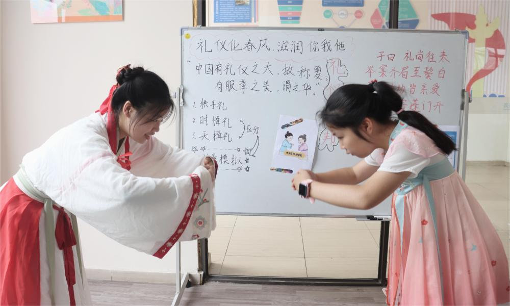 正衣冠、敬师长、敬同窗……,志愿者龙滕艳邀请小朋友们分别扮演长辈、同辈和校友等角色,在不同场景下,学习传统礼仪,感受传统文化的魅力。“传统礼仪特别有趣,跟我们现在的打招呼方式不一样,我要向我的爸爸妈妈展示天揖礼,他们一定很开心”,一年级的欣欣同学说道。