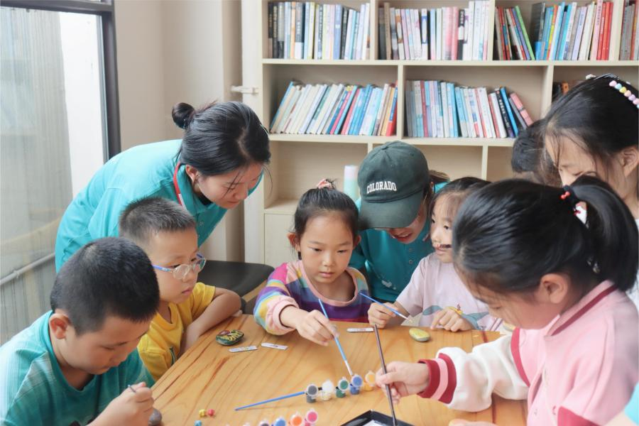 第一堂“小小石头画画画”非遗手工课上,志愿者余万兴以简笔画的形式向孩子们介绍喜、怒、哀、乐等面部表情的特点,生动而有趣的示范激发了孩子们的兴趣,纷纷想要上台展示自己的不同情绪。在分发石头和绘画材料后,孩子们勇敢尝试,一幅幅独特的石头画作品呈现在眼前。虽然他们的笔触稚嫩、画面稚拙,但充分表现出孩子们的童心和热情。