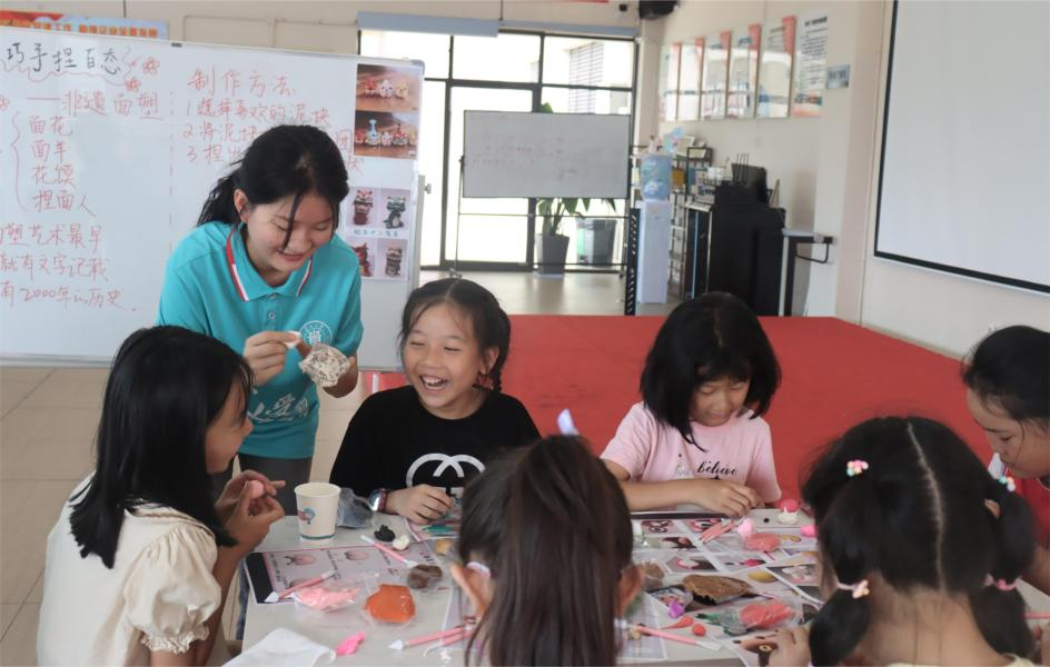 面塑俗称面花、礼馍、捏面人,以面粉、糯米粉等为原料,制成各种栩栩如生的形象,是中国一项传统民间艺术。志愿者宋语恬为小学生们介绍面塑文化,并从制作方法、造型捏制、装饰技巧等方面进行讲解和示范。随后,小学生们边学边做,先挑选喜欢的彩泥颜色,再用双手捏出大致形态,并借助工具刀将面团以点、切、刻、画的方式进行装饰。制作过程中,志愿者与孩子们一起合作,共同创作。