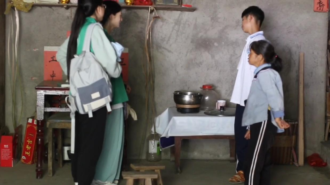 其中一户特别困难的留守儿童家庭——女孩朱朝玥家,母亲因病去世,父亲在外打工。她和外公外婆、婶婶、侄女同住,朱朝玥的叔叔也因病去世,婶婶患有唐氏综合症,侄女只有九个月大,外公手关节受伤不能做活。奶奶辛苦地操持着这个家。于是实践队成员共筹了266元作为一份微不足道的心意赠给两位老人,并合影留念。