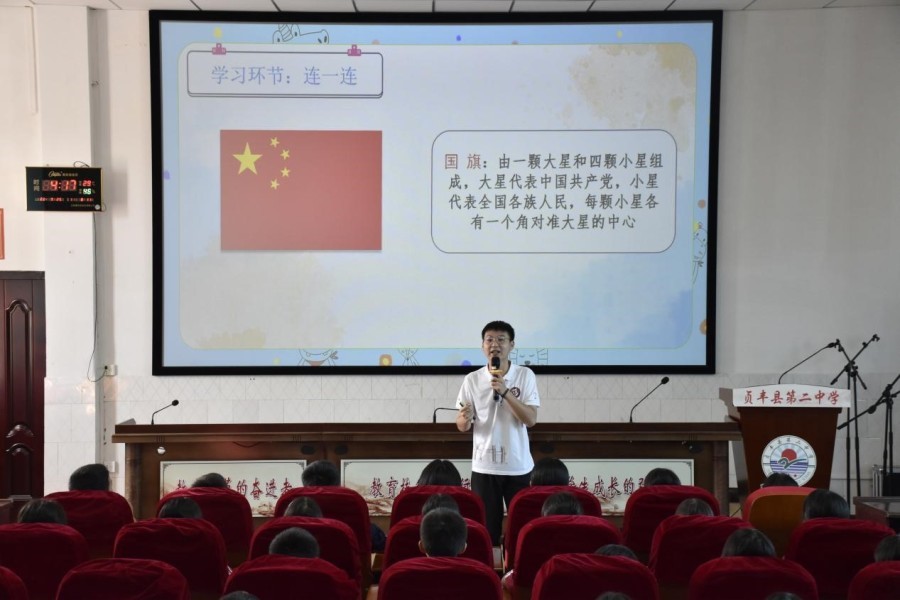活动伊始,王梓任为同学们讲授课程《祖国旗帜在我心》,课程中,王梓任带领同学们共同观看《开国大典》视频,并生动讲解祖国旗帜的含义。随后,张翼达带领学生共唱《我和我的祖国》,“我和我的祖国,一刻也不能分割……”,红色音乐凝聚爱国力量,嘹亮歌声传播爱国之情。