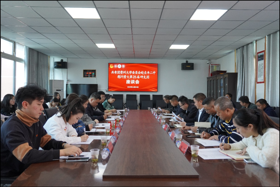 座谈会上,钱保华介绍了贞丰县第二中学的基本情况;我校第25届研支团成员姜若琪汇报了自7月以来第25届研支团贞丰支队工作情况;王露江代表贞丰县团委向我校第25届研支团的工作表示肯定和支持。宋洪庆代表我校向贞丰县第二中学对贵州大学西部计划工作的支持表达了感谢,对我校第25届研支团表达了慰问和关心,并对他们接下来的工作提出了要求。
