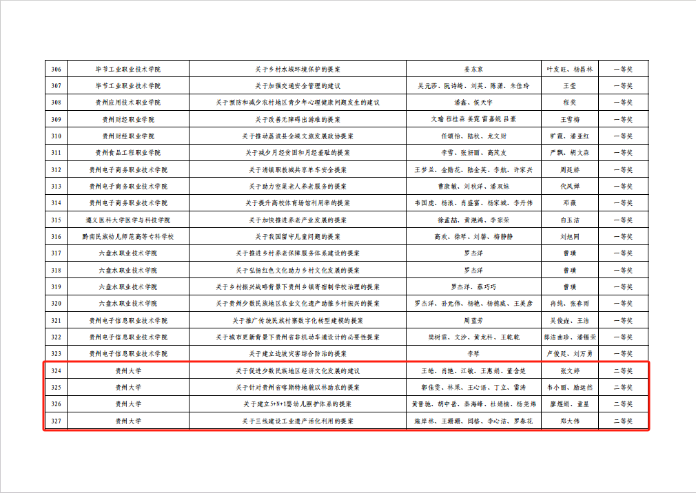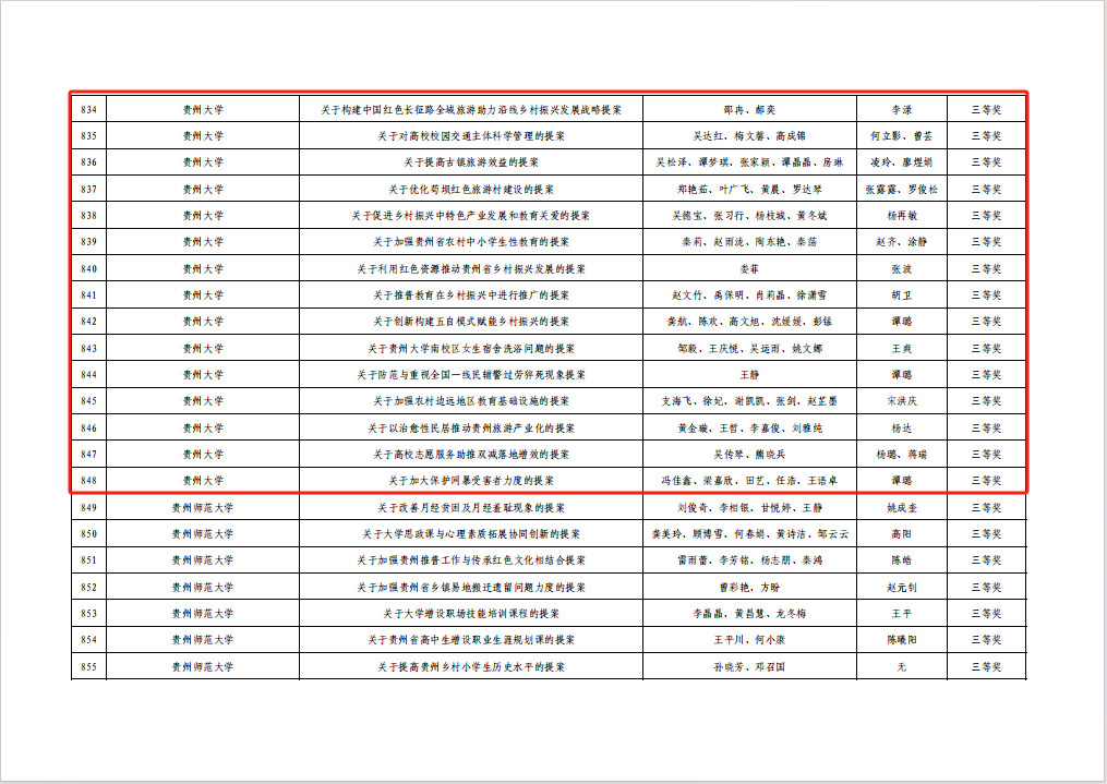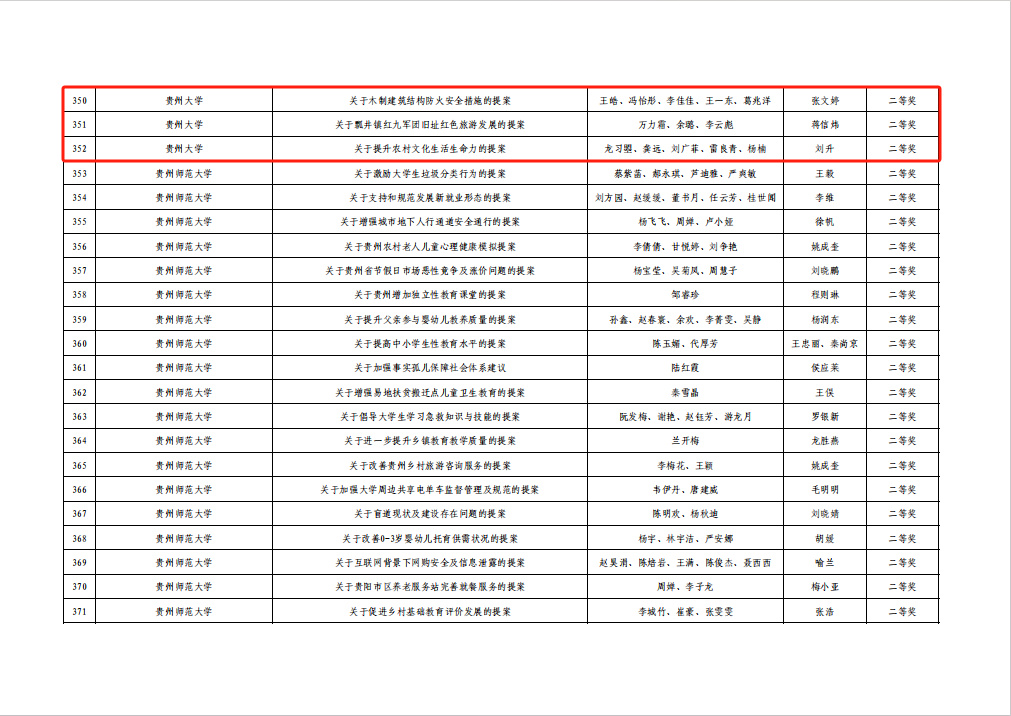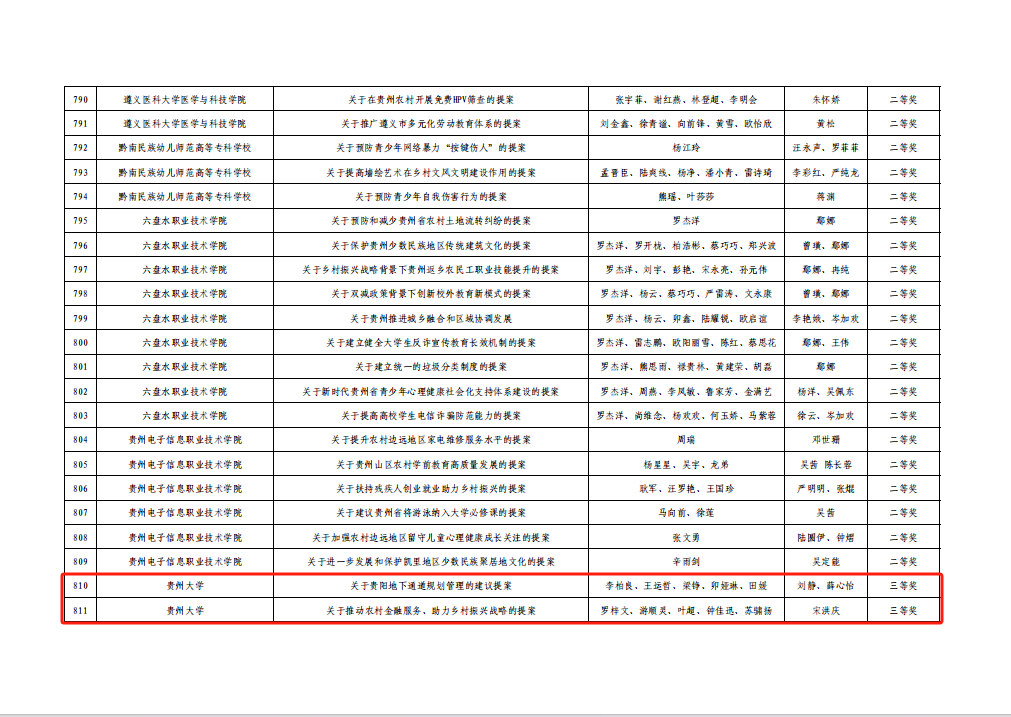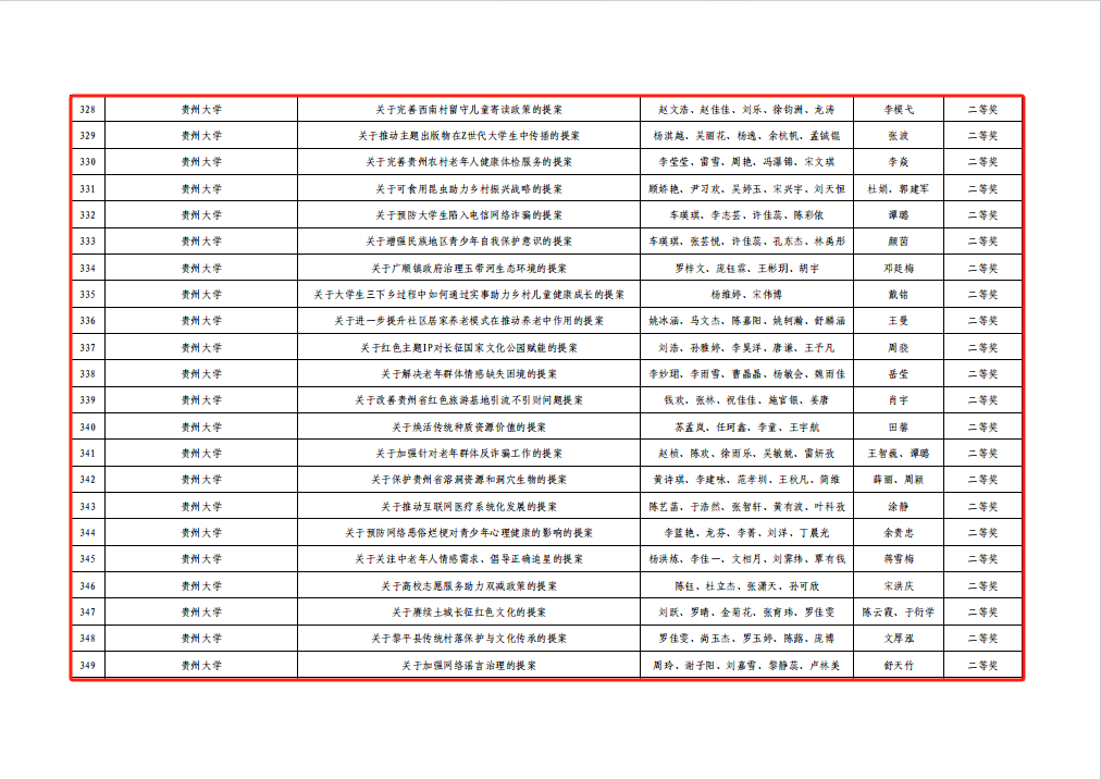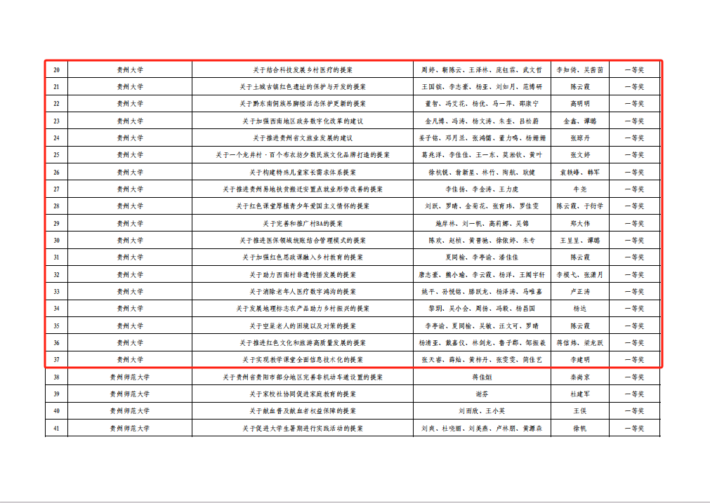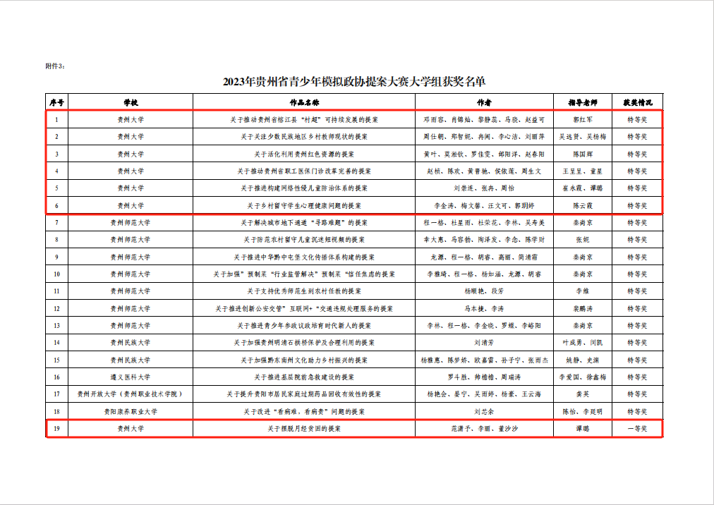 团委网站讯 近日,由共青团贵州省委、贵州省政协提案委及贵州省学生联合会共同举办的2023年贵州省青少年模拟政协提案大赛结果出炉。我校获评“优秀组织单位”,推选的提案作品获特等奖6项,一等奖19项,二等奖29项,三等奖39项。