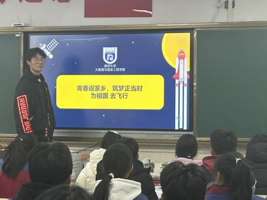 团委网站讯(记者 丁明航 报道|摄影 张艺轩 陈云山)1月11日,大数据与信息工程学院团委在黔南州贵定中学开展了“中国飞天梦,航天科普行”系列活动。本次活动由中国飞天梦科技志愿团贵州省总队贵州大学科技志愿者张艺轩授课,开展《通往蓝天之路》航空航天专题科普,普及航空航天常识,教授航空航天基础知识,培养青少年对航空航天文化兴趣。