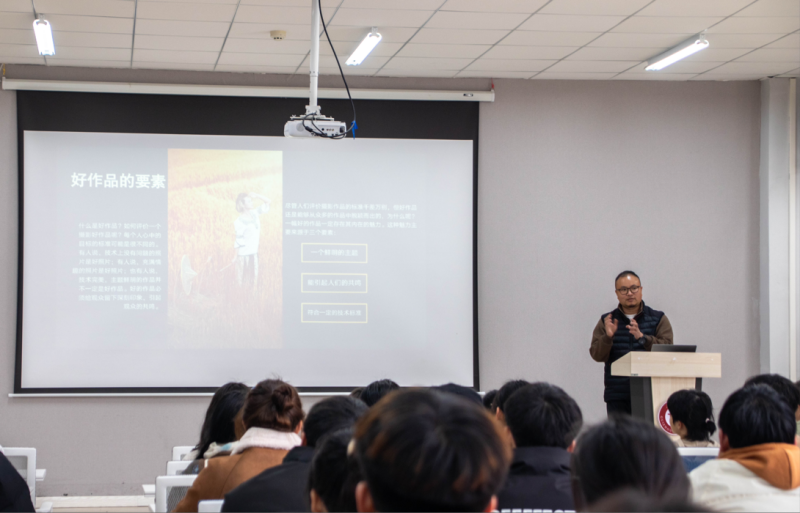 分享会上,周遵勇向同学们介绍了什么是好作品。他说,摄影要在生活中去发现美,一个好作品,需要一个鲜明的主题,要引起人们的共鸣,还要符合一定的技术标准。