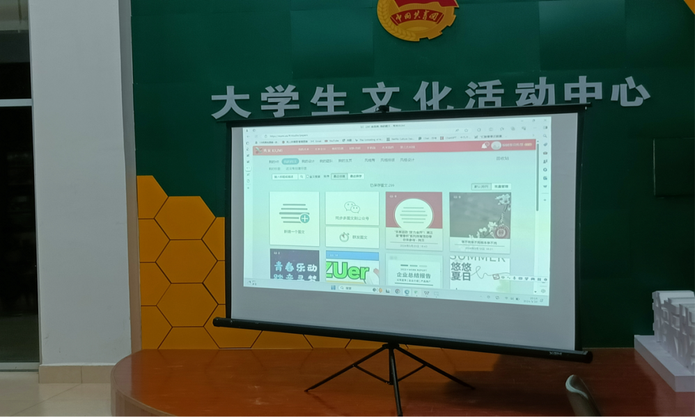 毛彩玲从校园生活类和新闻记要类两种排版风格、色彩搭配、组件变换、SVG的运用四个方面向同学们分享推文排版构思经验。花千蕊向大家展示了如何具体操作,为同学们带来了实用的技巧和灵感,并且明确了贵大青年公众号投稿规范。