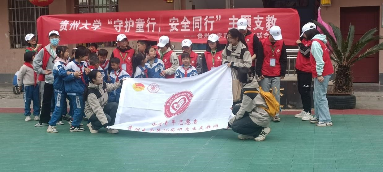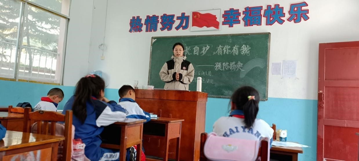 本次支教还邀请了贵州大学第26届研究生支教团的志愿者们一同开展。课堂铃声响起后,支教老师在二年级教室的黑板上写下本次上课的主题——“成长自护,有你有我”,展开预防拐卖的课程,帮助孩子们掌握了实用的安全技能。