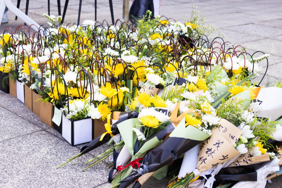 许多学生来到现场积极参与活动。工作人员们准备了各类与清明相关的花材,主要花材是重瓣的黄菊和白菊,庄严肃穆,装饰作辅的花材有绿箭草、石刁柏、尤加利叶、黄莺、水晶草等,给予同学们丰富的艺术构想。此外,现场还提供了两种包装方式,一种是用包装纸自行搭配捆绑成束,另一种是有序将花插入花座做成花篮。