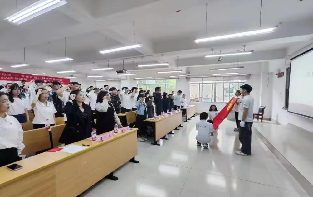 团委网站讯(记者 申雪 徐再 简莎莎 报道|摄影 曾忠华)5月6日,“青春挺膺担当--青春之我,创造青春中国”我校2024年新团员“五四”集体入团仪式在西校区贤正楼107报告厅成功举行。我校电气工程学院党委书记刘明锋,校团委书记刘魁、副书记宋洪庆出席,我校2024年新团员参加入团仪式。