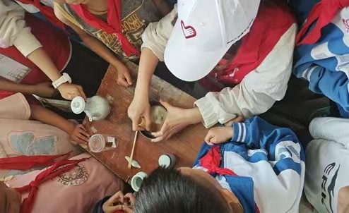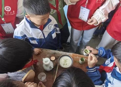 在“茶中的绘画艺术”课堂中,茶道社的志愿者们将中国非遗传统文化——茶百戏引入校园,让孩子们在点茶作画中感受茶文化的魅力,领悟茶中的人文精神,从而培养对中国传统文化的热爱。