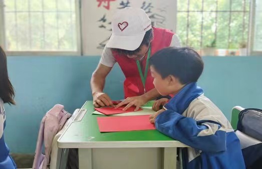 在支教服务队志愿者耐心地指导下,孩子们认真学习康乃馨的制作,通过康乃馨传达着对平凡劳动者的感恩和敬畏之心。