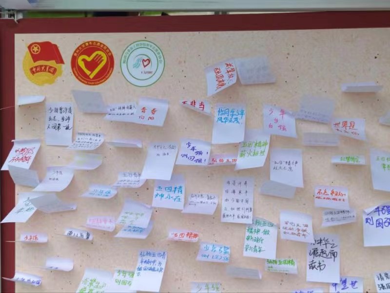 “当代青年有话说”活动中,同学们在便签上写下五四宣传标语和志愿心语,并将其贴在留言板上,在五四精神和志愿精神的传承与弘扬中,激发更多青年学生的爱国情怀与民族自豪感。