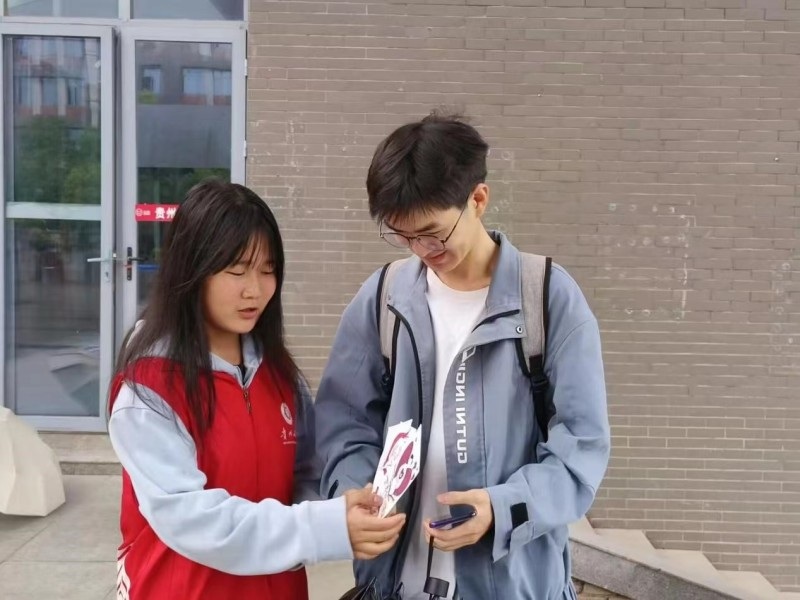 活动现场,同学们在校园内寻找隐藏在各个角落的卡片,并对卡片上的红十字日相关知识进行了学习,同时摆出了志愿公益相关的手势与卡片进行了合照。