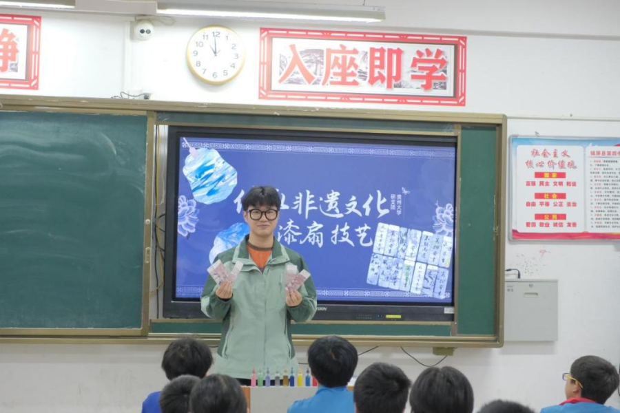 团委网站讯(记者 道胤龙 刘梓宸 报道│摄影 陆佳俊 王芷懿 周丹)近日,贵州大学第25届研究生支教团锦屏支队以中国非物质文化遗产——漆扇技艺为引,在锦屏县第四中学开展了“非遗文化进校园”活动,为学生们开启了一场传统文化的心灵之旅。