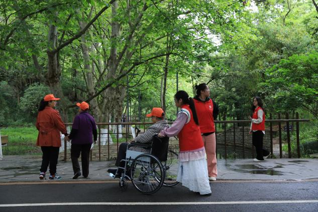 志愿者们搀扶着老人们一同漫步在公园里,行动不便的老人们也坐在轮椅上一同欣赏春日花溪公园的美景,欣赏绿树成荫、鲜花绽放,尽情享受春日的恬淡与宁静。