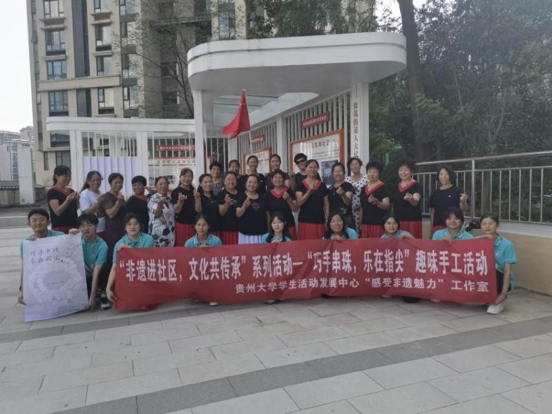 巧手串珠,乐在指尖。“孩子,你来看一下,这个转折该怎么串啊?”“你看我这个怎么扎不紧啊!”“感受非遗魅力”工作室的志愿者正指导社区居民们体验串珠活动,他们据个人的创意和技巧,制作出各式各样的串珠,并开心地向工作人员和旁边的伙伴展示成果。