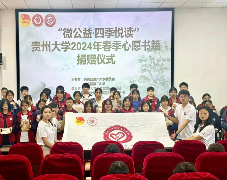 “微公益·四季悦读”春季心愿书籍捐赠仪式现场,研支团成员向学生代表捐赠图书,并鼓励同学们秉承爱读书、读好书、善读书的好习惯,做到学有所思、学有所悟、学有所得,涵养“腹有诗书气自华”的人生境界。据悉,“微公益·四季悦读”每季度开展一次,由贵州大学学子认领学生的心愿书籍,完成一对一个性化赠书,目前捐赠图书共计1200余册。
