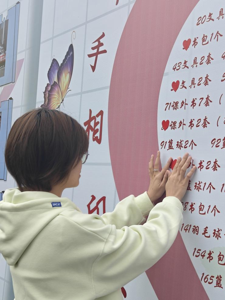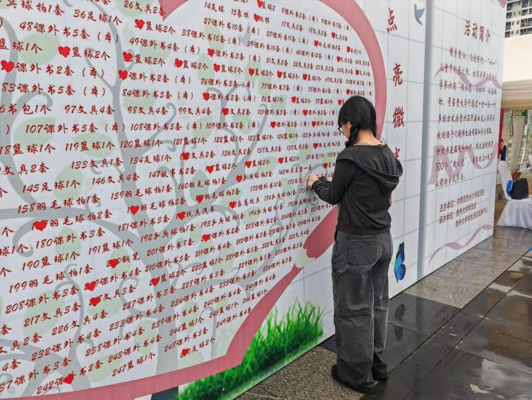 活动现场,学子们围着“心愿墙”,认真思索,动员室友、同伴等群体,共同认领心愿。刚认领108号心愿的王同学说道:“我觉得‘微心愿’不仅是一场公益活动,更是一种责任与担当的体现。我平时常参加校园活动,也获得过奖品,其中就有笔记本。我会动员我的室友,准备文具套装送给这名小朋友。希望他收到这份‘心愿’后,能好好学习。”