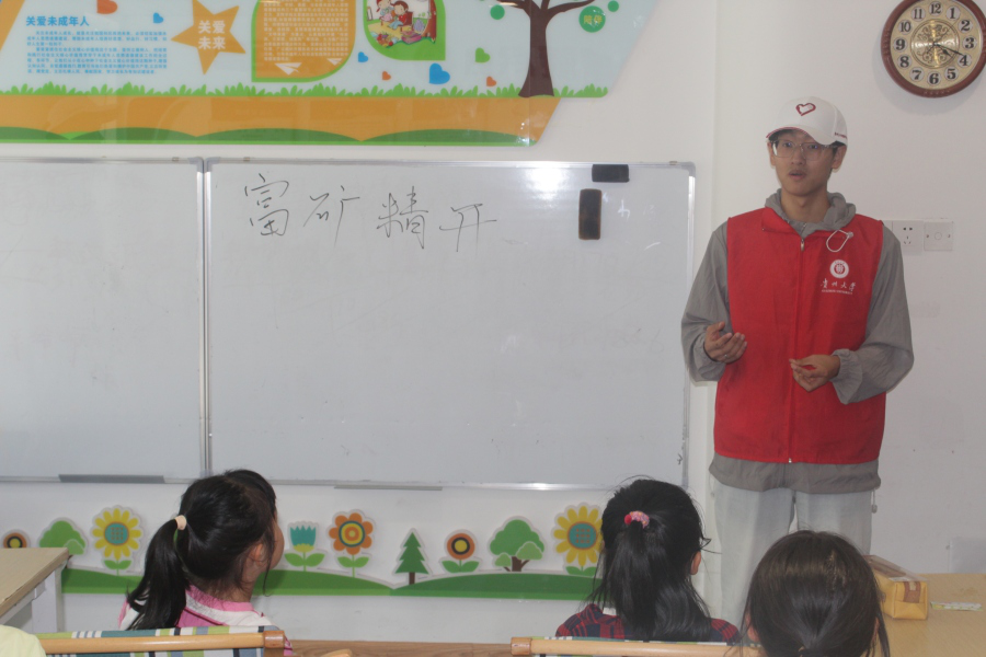 此外,今天的课程还特别安排了“富矿精开”专项分享会。来自矿业学院和机械学院的两位志愿者向孩子们分别介绍了什么是“富矿精开”、为什么要推进“富矿精开”、以及如何为“富矿精开”贡献力量。深入浅出强调了矿产资源对国家经济发展的重要性。孩子们在轻松愉快的氛围中,不仅增长了见识,还激发了对科学的热爱。