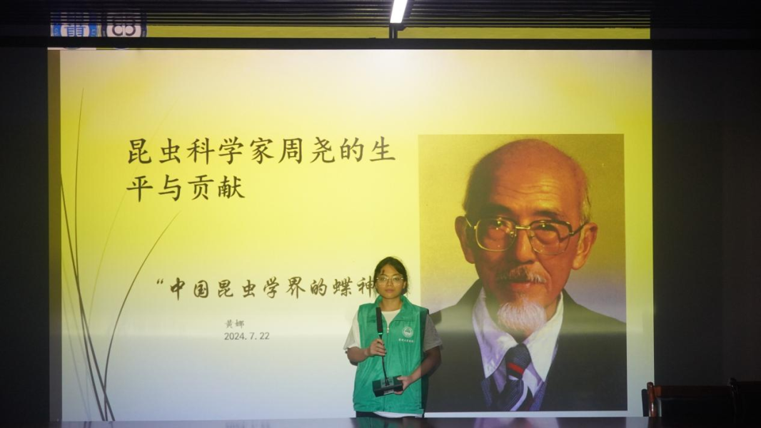 紧接着,志愿者谯青青通过丰富的视觉资料,将陈世骧教授的故事娓娓道来。陈世骧,一位在昆虫分类学领域做出巨大贡献的学者,他的研究为中国乃至世界的昆虫学发展提供了宝贵的资料,同时他的教育理念和人格魅力也深深地影响了一代又一代的学生。谯青青的讲述让孩子们感受到了陈世骧教授对昆虫的热爱,以及他在科学研究中所展现出的坚定与耐心。
