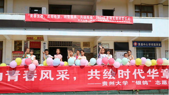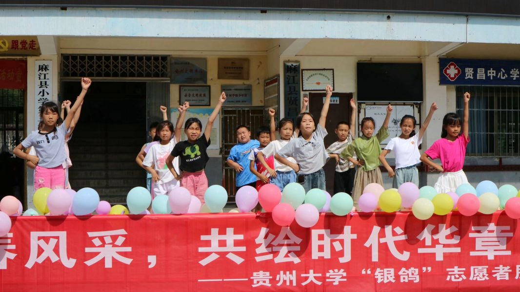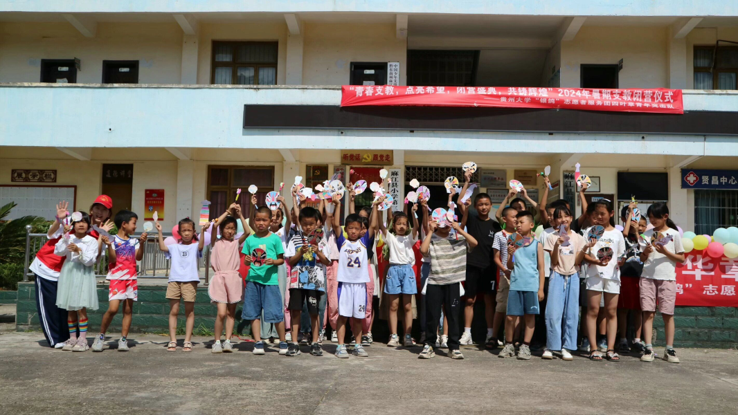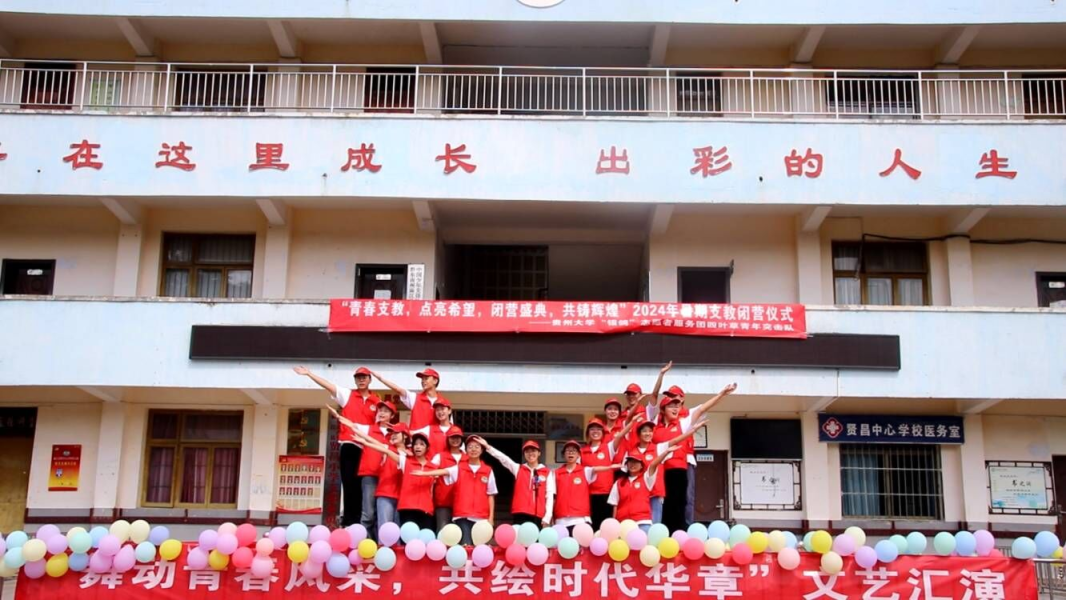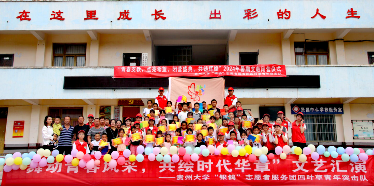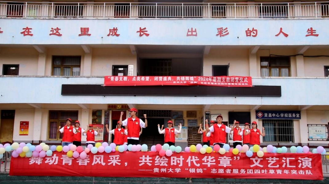 团委网站讯(记者 施官宇 报道 |摄影 徐婧 胡梦豪)7月24日,我校“银鸽”志愿者服务团四叶草青年突击队在贤昌中心学校举行了“舞动青春色彩,共绘时代华章”文艺汇演暨2024年暑期支教闭营仪式。本次活动主要是为了展示同学们在支教活动中学习的舞蹈、扎染、漆扇等课程成果,促进同学之间的团结合作关系,同时展现同学们青春洋溢的少年风貌。
