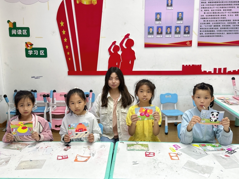 在动手制作环节。小朋友们分组而坐,每个人都拿到了自己心仪的贴画材料和工具。在支教团志愿者的指导和帮助下,他们开始认真构思、剪裁、粘贴,将自己心中的美好画面一点点呈现在贴画纸上。有的孩子选择了绚丽多彩的花朵,有的孩子则更喜欢活泼可爱的小动物,还有的孩子尝试制作了有趣的卡通形象。每一件作品都充满了童趣和创意,展示了孩子们独特的艺术天赋和想象力。