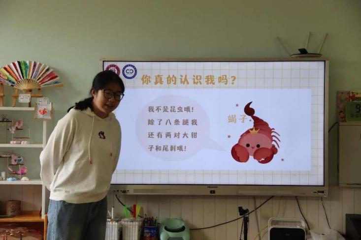 在简单的自我介绍过后,昆虫协会的志愿者为小朋友们介绍昆虫的相关知识。通过生动的PPT展示,列举了螳螂等常见的昆虫,并为小朋友们展示蝴蝶标本。