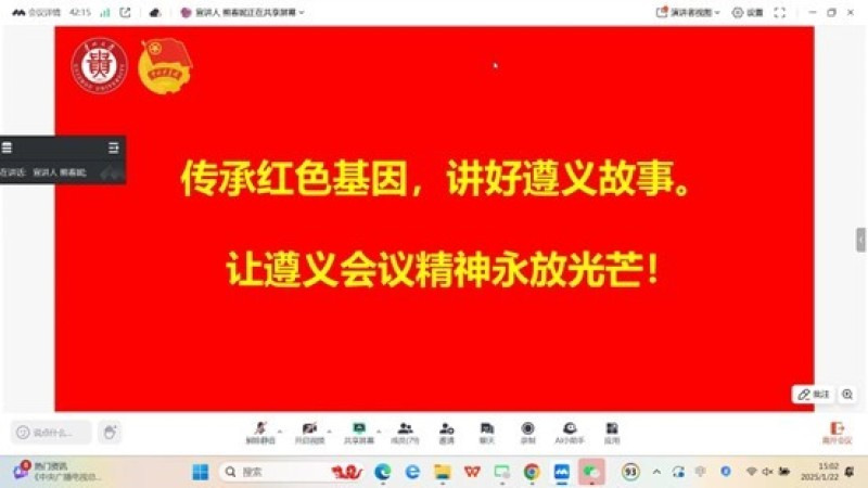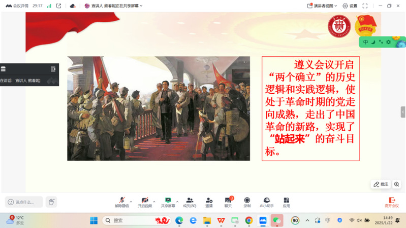 团委网站讯 1月20日至23日,我校第27届研究生支教团以“红脉启智:遵义会议精神点亮大中小思政逐梦路”为主题,借助腾讯会议平台,面向近400名学生开展线上宣讲。此次活动作为“寻遵义星火,筑思政通途”总策划下的首个板块,为传播遵义会议精神红色文化、筑牢思政根基迈出坚实一步。