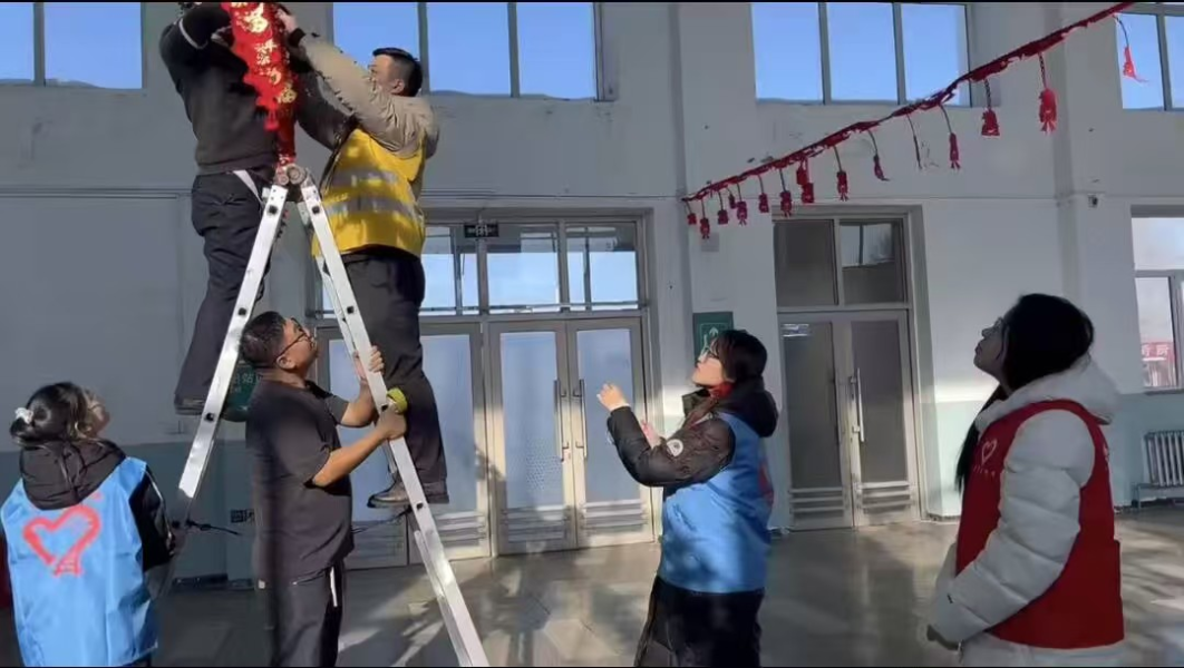 团队成员佩戴校徽工作牌,为南方游客提供指路、免费热水、暖贴等服务。春节期间,他们还在车站布置新春装饰,营造温馨氛围。团队日均服务超3小时,累计发放暖贴300余份,用实际行动搭建起沟通南北的连心桥。