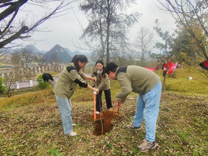 当天下午,研支团全体成员前往贞丰县双峰街道参与植树活动。大家分工协作,挥锹铲土、扶苗填坑、培实新土、提水浇灌,每一个环节都认真细致。研支团成员彭荣荣笑道:“每浇一桶水都像在播撒希望,这些树苗会和我们支教的孩子们一起成长,见证这片土地的绿色蝶变。”活动结束后,支教老师们将定期回访养护树苗,让“学雷锋”从一次行动延伸为四季守护的承诺。