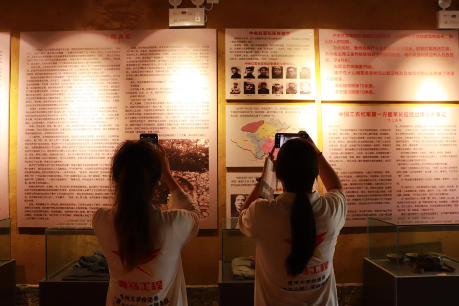陈列馆内,被硝烟熏黑的《中国工农红军总政治部布告》仿品记录下了布依族老人杨登凤和红军的故事。1935彭德怀、杨尚昆同志率部队抵达贵州省镇宁县版袍村时,杨登凤被红军的严明纪律所感动,主动为其提供食宿并协助他们进行宣传,红军走后,他秘密保存红军布告,并在1952年上交贵州省人民政府。此外陈列馆内还记录着许许多多红军和人民的故事,队员们被这些鲜活的红色故事深深打动,纷纷表示要继承和发扬红军精神,把红色基因融入新时代的青春奋斗中。